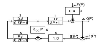Структурная схема САУ составляется с учётом заданных передаточных функций элементов САУ и их параметров. Она изображается в виде связанных между собой звеньев, с указанием их передаточных функций, точек приложения задающих и возмущающих воздействий, элементов суммирования и управляемой величины на выходе (см., например, рис.3.1)