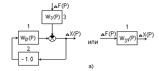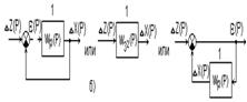 Например, на рис.3.2,а принимается DZ(Р)=0, а на рис.3.2,б - DF(Р)=0. При этом в схеме рис.3.2,а звено с передаточной функцией - 1.0 отражает отрицательный знак главной обратной связи замкнутой САУ. Для структурных схем рис.3.2,а эквивалентные передаточные функции соответственно имеют вид: