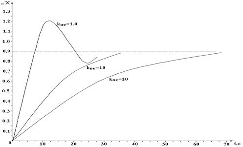 Рис.5.2. Переходная характеристика САУ рис.3.1 при входном воздействии Df(t) = 1.0 и различных значениях Koc.