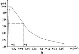 Рис.6.2. Амплитудная (а) и фазовая (б) частотные характеристики САУ рис.3.1 при входном воздействии Df(t) и Ку = 20, Кос = 20.