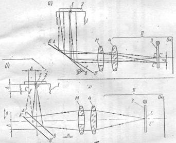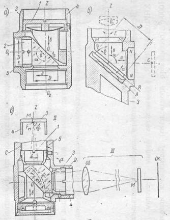 Наиболее просто собираются неподвижные зеркала и призмы наблюдательных труб (рис. 5 а и б), установленные перед объективом в параллельных пучках лучей.