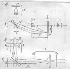 Удобно комбинированное оптическое устройство, позволяющее определять и наклон и параллельное смещение зеркала или призмы (рис. 8). Вместо сетки 1 трубки II (рис. 7, в) в трубке I (рис. 8, а) устанавливается зеркало 2 с маркой Е в центре Микроскоп I (рис. 7,в) заменяется автоколлимационной трубкой II с объективной насадкой М, имеющей круглое отверстие (рис. 8, а). При освещении сетки трубки II в торец лучи выйдут из объектива параллельными пучками и, пройдя отверстие в насадке отразятся от юстируемого зеркала А В и зеркала 2 (рис. 8, а).