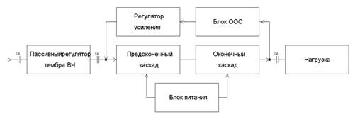 Входное устройство служит для передачи сигнала от источника сигнала во входную цепь предварительного усилителя тогда, когда прямое подключение к источнику сигнала невозможно или нецелесообразно. В нашем случае это конденсатор, который предотвращает попадание постоянной составляющей на вход регулятора тембра. Регулятор усиления используется для обеспечения желаемой мощности на выходе усилителя. Регулятор усиления может быть реализован в виде обычного делителя или выполнен по схеме с применением ООС ОУ. В разрабатываемой схеме регулятор усиления будет смонтирован в цепи обратной связи усилителя. Предоконечный каскад используется для усиления напряжения, тока и мощности сигнала до величины необходимой для подачи на вход оконечного каскада мощности. Оконечный каскад предназначен для отдачи в нагрузку необходимой мощности сигнала. Отрицательная обратная связь (ООС) охватывает усилитель и требуется для понижения нелинейных искажений усилителя, вносимых оконечным каскадом усилителя мощности и для повышения стабильности. Но при этом понижается коэффициент усиления каскадов охваченных ООС. Выходное устройство служит для передачи усиленного сигнала из выходной цепи в нагрузку. Применяется когда непосредственное подключение нагрузки невозможно или нецелесообразно. Конденсатор используется для разделения постоянных составляющих тока и напряжения выходной цепи и нагрузки. Источник питания используется для питания усилителя, его энергия преобразуется в энергию усиленного сигнала.