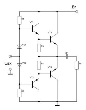 Данная схема является комплементарной схемой на составных транзисторах с несимметричным источником питания. Транзисторы VT1, VT3 и VT2, VT4 образуют составные транзисторы включённые по схеме с общим коллектором. Составные транзисторы используются с целью увеличения коэффициента усиления по току и входного сопротивления всего каскада. Резисторы R1 и R2 задают необходимую величину тока покоя предоконечных транзисторов. Резисторы R3 и R4 стабилизируют работу плеч каскада и создают в нем отрицательную обратную связь.