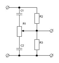 В ряде усилительных устройств необходимо регулировать АЧХ в определенных областях частот. Осуществляемая с помощью регуляторов тембра, она позволяет существенно приблизить тембр звучания к естественному. Для регулировки АЧХ используют пассивные частотно- зависимые цепи либо цепь с частотно- зависимой ООС. В этапе разработки структурной схемы, мы условились, что регулировку тембра сделаем пассивной. По техническому заданию требуется рассчитать регулятор тембра с двусторонней регулировкой в области ВЧ. Схема пассивного регулятора тембра ВЧ изображена на рис. 3