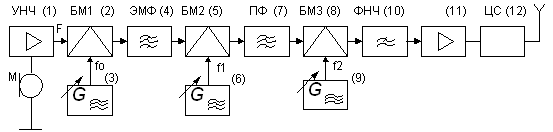 Звуковой сигнал с микрофона (М) усиливается усилителем низкой частоты (1) и попадает на балансный модулятор БМ1 (2). На второй вход БМ1 поступает напряжение с опорного генератора (3) с частотой f0. Частота этого генератора стабилизирована кварцем. Значение частоты f0 определяется АЧХ электромеханического фильтра (ЭМФ) и выбором рабочей боковой полосы (верхней или нижней) и составила f0 = 500 кГц. На выходе первого балансного модулятора получается двухполосный сигнал с ослабленной несущей. Степень подавления несущей частоты на выходе передатчика (в антенне) определяется балансным модулятором и ЭМФ, а нежелательной боковой полосы - только параметрами ЭМФ. Последующие каскады не могут изменить степень подавления этих составляющих однополосного сигнала.