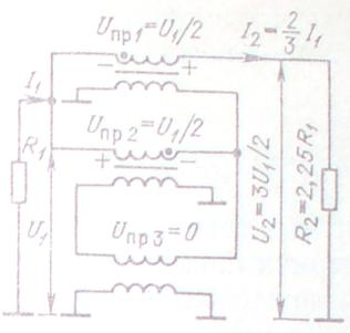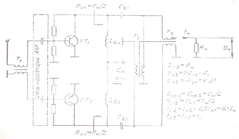 Для подключения нагрузки к коллекторам транзисторов используется трансфоматор-линия Т3 с волновым сопротивлением Z3 = Rн = Rэк/2 и продольным напряжением на ней Uпр = Uк и током Iл = Iн = Iк1.