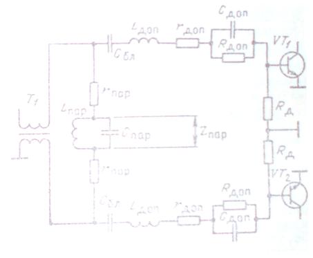 В коллекторной цепи трансформатор Т2 симметрирует напряжения основной частоты на коллекторах транзисторов и обеспечивает замыкание четных гармоник коллекторных токов с возможно малым сопротивлением, а трансформаторы Т3 осуществляют переход к несимметричной нагрузке. Питание подается через блокировочные дроссели Lбл. Поскольку постоянные составляющие коллекторных токов должны быть примерно одинаковыми, а через проводники Т2 они протекают в противоположных направлениях, то создается только незначительное дополнительное подмагничивание в магнитопроводе Т2.
