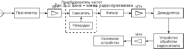 Успешно отфильтровать помехи и мешающие сигналы можно в том случае, когда частота полезного сигнала невелика. С этой целью в приемниках предусмотрено понижение принятой несущей частоты до некоторой промежуточной, на которой и осуществляется основная фильтрация. Типичная блок – схема радиоприемника приведена на рис.В.2.