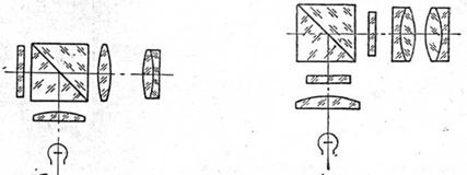 Окуляр с призмой-куб и двумя сетками (рис.4) получил широкое распространение в контрольно-юстировочных приборах. Поскольку призма-куб находится до первого фокуса окуляра, можно применять и короткофокусные окуляры. Все поле зрения для наблюдений свободно, сетки обычно различные: на одной индекс (крест, штрих и т. п.)