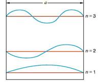 где n– номер квантового состояния, a – размер ямы. На рис. 2 изображены три такие функции, соответствующие n = 1, 2, 3, … Электронная плотность в яме распределяется неравномерно, есть максимумы и минимумы плотности вероятности. Из формулы (1) следует также, что длины волн Ч'-функций, описывающих электронные состояния с различными n, удовлетворяют условиям