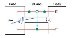 Для того чтобы квантовую яму превратить в лазер, нужно ее подсоединить к двум контактам, через которые электроны могут непрерывно поступать в рабочую область. Пусть через один контакт электроны поступают в зону проводимости. Далее, совершая скачки из зоны проводимости в валентную зону, они будут излучать кванты, то есть порции электромагнитного излучения (рис. 3). Затем через валентную зону носители тока должны уходить на другой контакт.