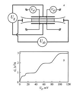 Одним из наиболее важных следствий получения одномерных баллистических каналов внутри гетероструктур GaAs-AGaAs и кремниевых сверхрешёток стало обнаружение квантования проводимости в зависимости от напряжения на затворе, управляющего шириной квантовой проволоки (рис. 4, а), которое проявляется в виде серии плато одномерной проводимости, разделенных ступенями величиной gsgve2/h; гдеgs и gv – спиновый и долинный факторы соответственно. Рост напряжения на затворе приводит к увеличению ширины квантовой проволоки, тем самым стимулируя заполнение большего числа подзон размерного квантования. При этом зависимость G(Vg) имеет ярко выраженный ступенчатый характер, так как кондактанс квантовой проволоки изменяется скачком каждый раз, когда уровень Ферми совпадает с одной из подзон размерного квантования: