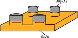 На рис. 5 показаны квантовые точки, созданные на границе раздела арсенида галлия и арсенида алюминия–галлия. В процессе роста в полупроводник AlGaAs были введены дополнительные примесные атомы. Электроны с этих атомов уходят в полупроводник GaAs, то есть в область с меньшей энергией. Но они не могут уйти слишком далеко, так как притягиваются к покинутым ими атомам примеси, получившим положительный заряд. Практически все электроны сосредоточиваются у самой гетерограницы со стороны GaAs и образуют двумерный газ. Процесс формирования квантовых точек начинается с нанесения на поверхность AlGaAs ряда масок, каждая из которых имеет форму круга. После этого производится глубокое травление, при котором удаляется весь слой AlGaAs и частично слой GaAs (это видно на рис. 5).