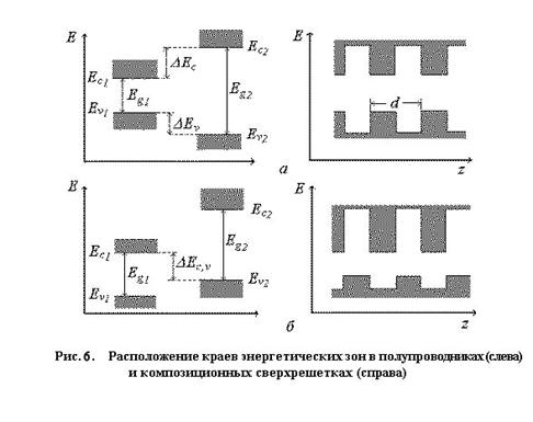 По расположению энергетических зон полупроводников композиционные сверхрешетки разделяются на несколько типов. Полупроводниковая сверхрешетка GаАs - АlxGa1-xАs относится к сверхрешеткам I типа у которых минимум зоны проводимости Еc1и максимум валентной зоны Еv1 одного полупроводника по энергии расположены внутри энергетической щели другого (рис. 6, а). В сверхрешетках этого типа возникает периодическая система квантовых ям для носителей тока в первом полупроводнике, которые отделены друг от друга потенциальными барьерами, создаваемыми во втором полупроводнике. Глубина квантовых ям для электронов ΔЕС определяется разностью между минимумами зон проводимости двух полупроводников, а глубина квантовых ям для дырок - разностью между максимумами валентной зоны ΔЕv (рис. 6, а).