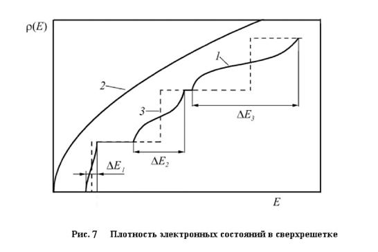 Плотность электронных состояний в полупроводниковой сверхрешетке существенно отличается от соответствующей величины в трехмерной электронной системе. На рис. 7. показана зависимость плотности электронных состояний