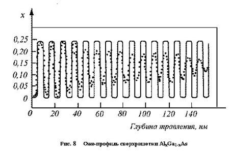 В работах по исследованию полупроводниковых сверхрешеток значительное место занимают вопросы, связанные с изучением профиля сверхрешеточной структуры и совершенства границ гетеропереходов. Из структурных методов наибольшее распространение получили два: определение глубинного профиля концентраций элементов методом электронной оже-спектроскопии (ЭОС) в сочетании с ионным травлением и малоугловая дифракция рентгеновских лучей.