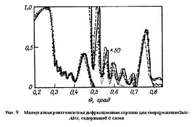 На рис. 9 представлена дифракционная картина в малоугловой области для сверхрешетки GaAs – AlAs, содержащей 6 периодов (2). Точки на этом рисунке представляют экспериментальные результаты, сплошная кривая – результат теоретических расчетов для d = 12,72 нм. Экспериментальная и расчетная дифракционная картины согласуются не только по положению пиков, но и по интенсивности и ширине линий. Штриховая кривая соответствует теоретическим расчетам, при которых изменен период сверхрешетки всего на 0,28 нм, что соответствует изменению толщины всего на два атомных слоя. Отличие от экспериментальных результатов в этом случае существенно. Эти оценки свидетельствуют о возможности контроля этим методом совершенства границ и когерентности периодов с атомной точностью. В случае плавного изменения межплоскостного расстояния на границе между слоями сверхрешетки, кроме дополнительных рефлексов в малоугловой области наблюдаются сверхструктурные рефлексы (сателлитные отражения), сопровождающие основные рефлексы на рентгенограммах.