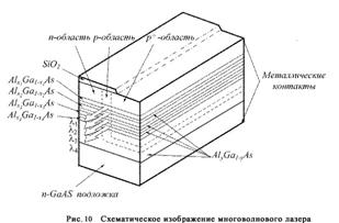 В качестве примера на рис. 10 показано схематическое изображение структуры многоволнового лазера (6). В структуре имеется четыре активных слоя AlxGa1-xAs разного состава (x = x1, x2, x3, x4), благодаря которым лазер одновременно работает на четырех длинах волн