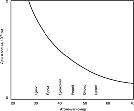 Рис. 2. ДЛИНА ВОЛНЫ ХАРАКТЕРИСТИЧЕСКОГО РЕНТГЕНОВСКОГО ИЗЛУЧЕНИЯ, испускаемого химическими элементами, зависит от атомного номера элемента. Кривая соответствует закону Мозли: чем больше атомный номер элемента, тем меньше длина волны характеристической линии.