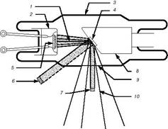 Рис. 3. РЕНТГЕНОВСКАЯ ТРУБКА КУЛИДЖА. При бомбардировке электронами вольфрамовой антикатод испускает характеристическое рентгеновское излучение. Поперечное сечение рентгеновского пучка меньше реально облучаемой площади. 1 – электронный пучок; 2 – катод с фокусирующим электродом; 3 – стеклянная оболочка (трубка); 4 – вольфрамовая мишень (антикатод); 5 – нить накала катода; 6 – реально облучаемая площадь; 7 – эффективное фокальное пятно; 8 – медный анод; 9 – окно; 10 – рассеянное рентгеновское излучение.