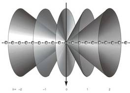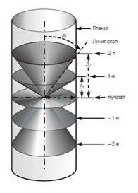 Рис. 5. РЕШЕНИЕ УРАВНЕНИЙ ЛАУЭ при каждом значении h можно представить в виде семейства конусов, общая ось которых направлена по кристаллографической оси (для двух других осей можно нарисовать сходные картины). На уравнениях Лауэ основан эффективный метод исследования кристаллических структур.