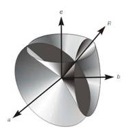 Рис. 6. ОБЩЕЕ РЕШЕНИЕ УРАВНЕНИЙ ЛАУЭ соответствует пересечению трех конусов с осями a, b, c, имеющих общую прямую R.