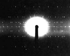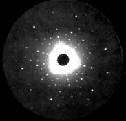 Рис. 7. ЛАУЭГРАММА. Через неподвижный кристалл пропускается рентгеновское излучение широкого спектрального диапазона. Дифракционным пучкам соответствуют пятна на лауэграмме.