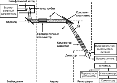 Рис. 11. РЕНТГЕНОВСКИЙ СПЕКТРОМЕТР (блок-схема) с кристаллом-анализатором. Основные блоки прибора: блок возбуждения образца (с рентгеновской трубкой), блок анализа с плоским кристаллом-анализатором и коллиматорами и блок регистрации с электронным детектором.