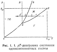 Рідкий стан речовини є проміжним між твердим і газоподібним (мал. 1.1). Область існування рідини обмежена з боку низьких температур переходом в твердий стан (точки cdd') аз боку високих — переходом в газоподібний стан (точки с, е).ЛініяАК, щорозділяє рідку і газоподібну фази, закінчується критичною точкою, відповідній температурі Ткрі тиску Pкр, вище за яких неможливе існування рідини в рівновазі з парою. Лінія рівноваги рідина — тверда фаза критичної точки не має. У металів температура плавлення підвищується із збільшенням тиску (крива АВ); у льоду, кремнію, германію — знижується (криваАВ'). ТочкаА надіаграмі стану відповідає температурі і тиску, при яких в закритій посудині знаходяться в рівновазі тверда, рідка і газоподібна фази. Рідині поєднують деякі властивості як твердих тіл, так і газів. Тверді тіла бувають кристалічні і аморфні. По типах зв'язку кристали діляться на атомні, іонні, металеві і молекулярні. Вони мають ближній і дальній порядок. Ближній порядок означає правильне розташування біля фіксованого атома, іона або молекули певного числа найближчих сусідів. Дальнім порядком називається розташування частинок в певній послідовності з утворенням єдиної тривимірної гратки. За наявності дальнього порядку відстань до будь-якого атома кристала обчислюється через параметри елементарної комірки по формулі