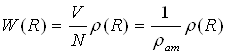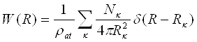 де ρат — середнє число атомів в одиниці об'єму. Згідно цьому співвідношенню значення W(R) рівні відношенню істинної кількості атомів в одиниці об'єму до середньої атомної густини. Тому W(R) має сенс відносної радіальній функції розподілу. Функція W(R) є найважливішою і основною характеристикою структури атомарних рідин і аморфних тіл.