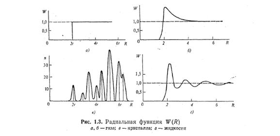 Рідини. Амплітуда теплових коливань атомів біля положень рівноваги в рідині набагато більше, ніж в кристалах. До того ж атоми рідини, беручи участь в тепловому русі, безперервно обмінюються своїми найближчими сусідами. Якщо в думках прослідити за рухом якого-небудь атома в рідині, то можна переконатися, що за час спостереження він знаходитиметься на самих різних відстанях від фіксованого атома. Внаслідок цього функція W(R) буде безперервною. У інтервалі 2r