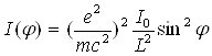 де m — маса електрона; e — його заряд; c — швидкість світла; φ — кут між напрямами коливання електрона і розсіюванням; e2/(mc2)— класичний радіус електрона, рівний 2,8•10-15м; (e2/(mc2))2— його поперечник розсіювання. З (20) видно, що із збільшенням кута φ інтенсивність розсіювання збільшується, досягаючи найбільшого значення при φ = 90° (мал. 2.1).