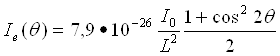 де (1+cos22θ)/2 = ρ(θ) — кутова залежність інтенсивності розсіяного рентгенівського випромінювання одним електроном названа поляризаційним чинником. Наявність цього множника у формулі (21) указує на те, що рентгенівське випромінювання при розсіянні частково поляризується. При гранично малих кутах розсіювання поляризаційний чинник рівний одиниці. Із збільшенням кута розсіювання цей чинник зменшується і при 2θ = 90° досягає значення, рівного 1/2. Таким чином, в різних напрямах інтенсивність розсіювання рентгенівського випромінювання одним електроном неоднакова. У напрямі первинного пучка і у зворотному напрямі інтенсивність розсіювання максимальна, а в перпендикулярному напрямі — мінімальна. Якщо у формулу (21) підставити значення постійних m, e і c то одержимо