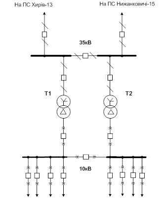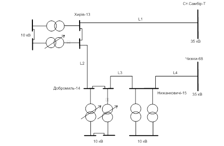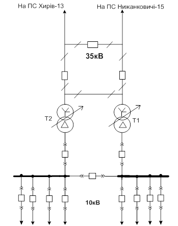 На підстанції «Добромиль-14» 35/10 кВ, схема якої наведена на рис.1.3, встановлено два трансформатори потужністю 4 і 2.5 МВ×А. Від шин 10 кВ живляться споживачі потужністю 3.366+j1.84МВ×А