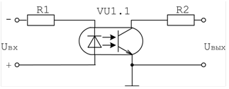 Падение напряжения насыщенного фототранзистора мало, следовательно, при логической единице на входе источник питания, подсоединённый к выходу, будет закорочен. Для ограничения тока, протекающего через насыщенный фототранзистор, поставили резистор R2. Резистор R1 выполняет роль ограничителя тока на входе оптоэлектронного прибора.