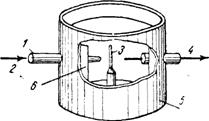 Рис.6 Принципиальная схема съемки по методу порошка: 1 - диафрагма; 2 - место входа лучей; 3 - образец: 4 - место выхода лучей; 5 - корпус камеры; 6 - (фотопленка)