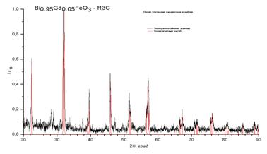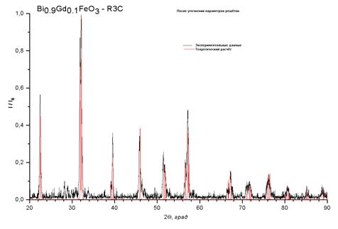 Для GdxBi1-xFeO3 рассчитывались рентгенограммы и строились ячейки в пространственной группе 161 (R3c), так как в силу особенностей синтеза это вещество может принадлежать к той или иной пространственной группе.