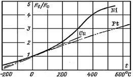 где Rt — сопротивление термометра при температуре t, Ом; R0 — сопротивление термометра при температуре 0°С (273,15 К), Ом.