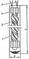 Рис. 5.1. Схема устройства платинового термометра сопротивления П.Г. Стрелкова. 1 – каркас, 2 – платиновая спираль, 3 – выводы, 4 – оболочка.