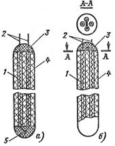 Чувствительный элемент на керамическом каркасе (рис. 5.2) состоит из двух или четырех соединенных последовательно платиновых спиралей 1. К двум верхним концам этих спиралей припаяны короткие платиновые выводы 2 или выводы из сплава иридия с родием (60% родия), к которым привариваются необходимой длины выводные проводники и на них надеваются бусы из керамики. Платиновые спирали помещены в каналы керамического каркаса 4. Крепление платиновых спиралей и выводов в каркасе осуществляется глазурью (или термоцементом) 3, изготовляемой на основе окисей алюминия и кремния. Коэффициент линейного расширения глазури близок к коэффициентам линейного расширения материала выводов и каркаса. Электрическое сопротивление глазури при 500–700°С составляет около 0,5–1 МОм. Подгонка номинального сопротивления ЧЭ R0 при 0°C осуществляется постепенным уменьшением длины нижних концов двух платиновых спиралей с последующей пайкой в точке 5 (рис. 5.2, а).