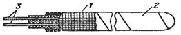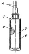На рис. 5.4 показан бескаркасный ЧЭ медного термометра сопротивления типа ТСМ, который выполнен из изолированной медной проволоки диаметром 0,08 мм безындукционной бескаркасной намоткой, покрытой фторопластовой пленкой. К концам обмотки припаяны выводы из медной проволоки. С целью обеспечения вибростойкости чувствительный элемент вставляют в тонкостенный металлический защитный чехол, который засыпается керамическим порошком и герметизируется.