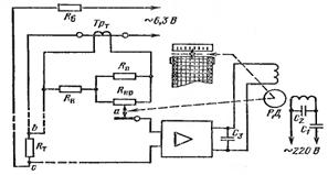 Питание измерительной схемы осуществляется напряжением переменного тока 6,3 В, частотой 50 Гц от вторичной обмотки силового трансформатора усилителя. Термометр сопротивления Rт и балластный резистор включены в схему последовательно с первичной обмоткой трансформатора тока Tpт. Нагрузкой вторичной обмотки трансформатора тока являются резистор Rн и приведенное сопротивление реохорда Rп.р. Рассматриваемая схема прибора позволяет измерять активное сопротивление термометра путем автоматической компенсации напряжения, возникающего на зажимах термометра bc, противоположным ему по фазе напряжением, снимаемым с резистора Rн, и сопротивления реохорда левее движка a.