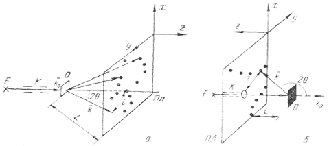 Рис. 3 Схема съемки рентгенограмм по методу Лауэ (а – на просвет, б – на отражение, F – фокус рентгеновской трубки, К – диафрагмы, O – образец, Пл - пленка)