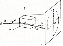 В этих условиях от плоскости произойдет отражение, и отклоненный луч даст на фотопластинке, помещенной перпендикулярно направлению первичного луча, почернение в некоторой точке Р. Будем далее поворачивать кристалл вокруг направления первичного луча (O1O) таким образом, чтобы падающий луч все время составлял с плоскостью отражения (100) угол q (это может быть достигнуто, если линию тп, лежащую в плоскости отражения, поворачивать так вокруг направления O1O, чтобы она описывал конус, образуя все время с направлением угол q). Тогда отраженный луч опишет конус, осью которого является первичный луч (O1O), и угол при вершине равен 4q. При непрерывном вращении кристалла след отраженного луча на фотопластинке опишет непрерывную кривую в виде окружности (кольца).