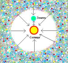 Рис. 3. Пояснение к рисунку – простейший вариант. Итак, звезда прежде всего – специфически огромное скопление частиц в единице объема. Из рисунка понятно, что Солнце находится внутри сферы из звезд. Звездная сфера, излучая продольные упругие волны, постоянно «сжимает» материю Солнца. Отсюда - экстремальное давление. Отсюда – плотность вещества. Отсюда – температура. Из всего этого – сила отталкивания-сталкивания звездной сферы – запал и истинная причина идущего на Солнце термоядерного процесса. То же – для любой звезды. Из этого - существование только двух объектов во Вселенной – Земли и Солнца – невозможно в принципе. Они просто оттолкнули бы друг друга навсегда, не встречая сопротивления контрсил отсутствующей звездной сферы. Соответственно, и частицы Солнца при этом разлетелись бы вслед за своими упругими колебаниями. И главное, что понятно из этого; - реальная физическая взаимосвязь между всеми массами Вселенной. Оказывается, что звезды не просто так для блезиру и за здорово живешь понапиханы да понатыканы там и сям. Как об этом нам сегодня безапелляционно вещает мировая наука. Природа щедра, но не глупа. Просто – нужен правильный подход и она, Природа, всегда готова открыть то, что нам кажется тайной. А что там мировая наука? Спит? Не спи! Замерзнешь.