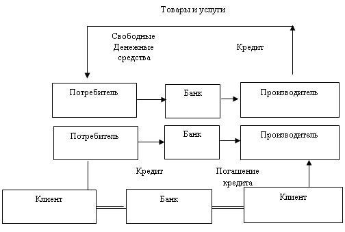 Чем же отличаются банки от других финансовых посредников? Во-первых, для банков характерен двойной обмен долговыми обязательствами: они размещают собственные долговые обязательства, а мобилизованные на этой основе средства размещают в долговые обязательства и ценные бумаги, выпущенные другими. Во - вторых, банки отличает принятие на себя обязательств с фиксированной суммой долга перед юридическими и физическими лицами. В-третьих, банки опосредуют движение денежных средств между государствами, предприятиями, населением, осуществляя расчетно-кассовое обслуживание, выпуская и обслуживая электронные деньги, пластиковые карты. Можно сказать, что сущность банков в аккумуляции капитала, не участвующего в производственном процессе и приложение данного капитала к труду, делу с целью создания новых благ и услуг. То есть банки являются посредниками между производителем и потребителем, при этом они участвуют в двухстороннем обмене. Наглядно это можно продемонстрировать в виде следующей схемы:
