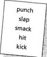 Of course, reliance on real objects, illustration, or demonstration, is limited. It is one thing to mime a chicken, but quite another to physically represent the meaning of a word like intuition or become or trustworthy. Also, words frequently come up incidentally, words for which the teacher won't have visual aids or realia at hand. An alternative way of conveying the meaning of a new word is simply to use words – other words. This is the principle behind dictionary definitions. Non-visual, verbal means of clarifying meaning include: