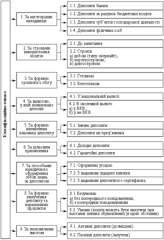 Класифікація депозитів за категоріями вкладників, економічним змістом, строками, валютою, згідно роботи (22), наведена на рис.1.2