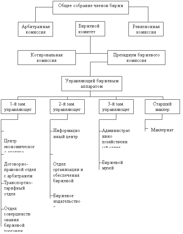 Для облегчения своей работы членам биржи предоставлено право нанимать служащих, которым разрешен доступ в торговый зал в виде клерков или посыльных. Руководство биржами осуществляют специальные выборные органы: Совет Управляющих и различные комитеты, создаваемые в привязке к определенным сферам биржевой жизни. (рис.1)